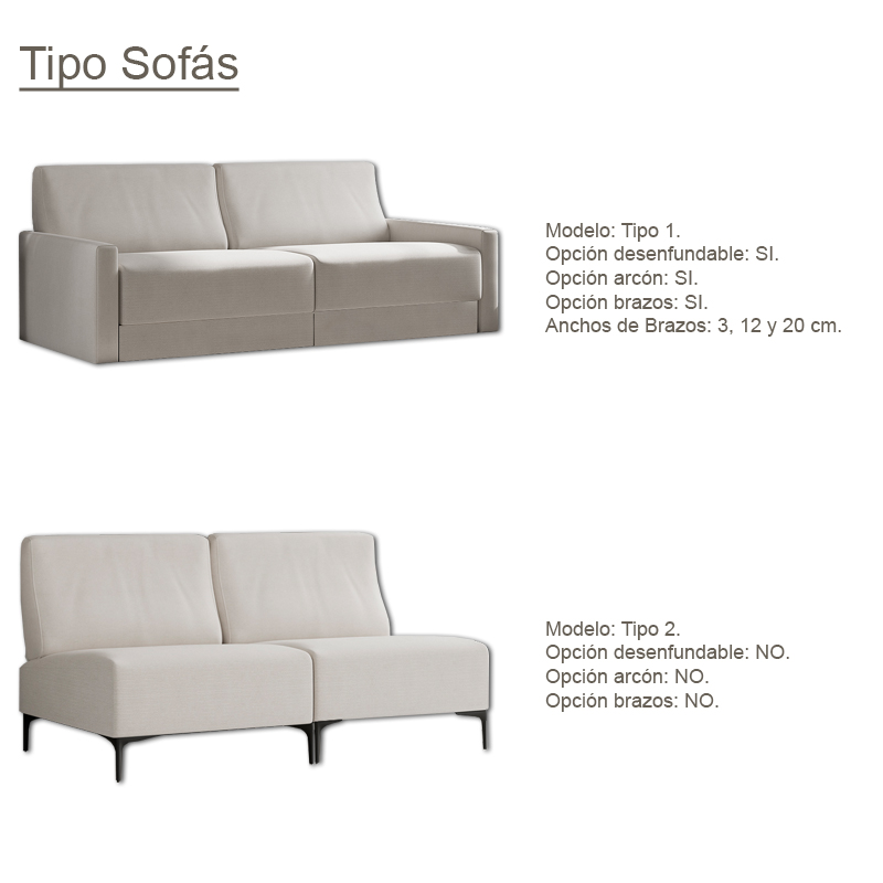 Sofá con estructura en Madera de pino y tablero de partículas. los asientos disponen de cinchas elásticas tipo Nea, espumación Hr de 30 Kg de densidad recubierto con fibra. Respaldo s confeccionado en bloque de espuma de 25 Kg de densidad recubierto con fibra. OPCIONAL ASIENTOS DESENFUNDABLES Y CON ARCÓN BAJO LOS ASIENTOS (NO DISPONIBLE EN SOFÁ MODELO TIPO 3).