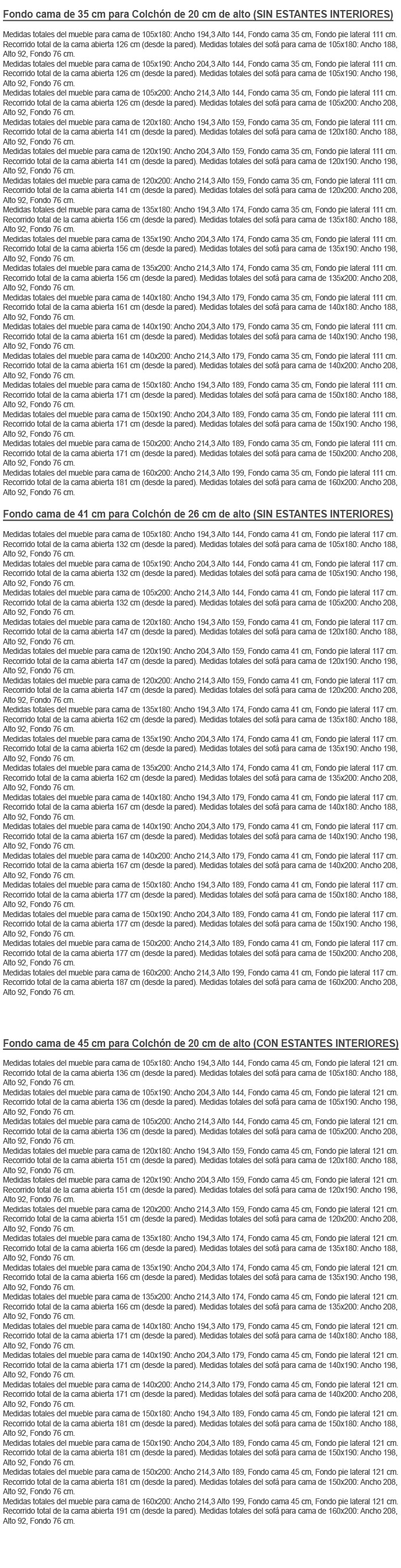 FONDO CAMA DISPONIBLE EN 35 Y 41 CM SIN ESTANTES Y EN 45 CM CON ESTANTES INTERIORES.