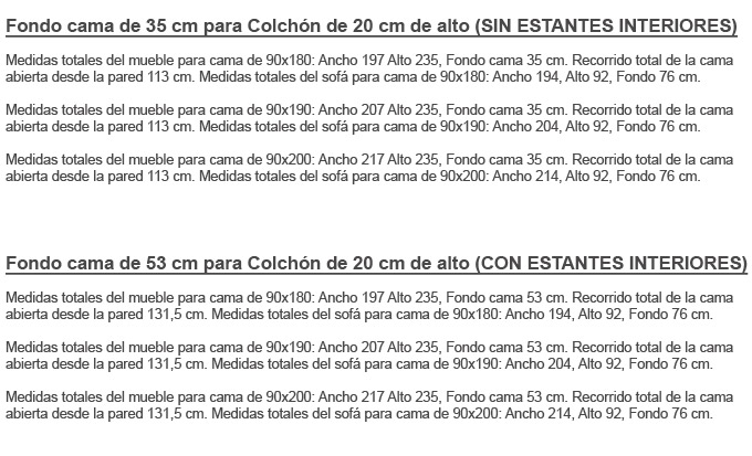LA CAMA ESTA DISPONIBLE EN FONDO CAMA DISPONIBLE EN 35 CM SIN ESTANTES Y EN 53 CM CON ESTANTES INTERIORES.